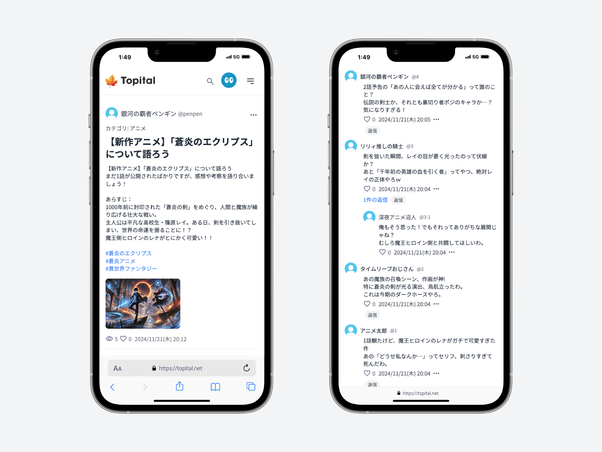 最近、SNSや掲示板では情報の流れが速く、アニメやゲーム、マンガといった趣味を深く語り合う場所が減少しています。SNSでは話題が埋もれ、掲示板では匿名性が高すぎて居心地が悪いと感じることも多いでしょう。そんな中、サブカルチャーを愛する人たちが「気軽に集まれる、じっくり話せる場所」を求めていると感じ、「Topital」を立ち上げました。Topitalは、サブカル好きが集まり、趣味の話題で盛り上がったり、情報を共有したりできるフォーラム型サービスです。現在はサービス開始したばかりで、ユーザー数は少ないですが、クラウドファンディングを通じて多くの人に知ってもらい、より充実したコミュニティを提供していきたいと考えています。