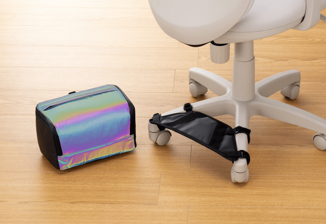 ゲーミングチェアの脚部(座面下)のデッドスペースを活用し、バッグは足元にすっきり収まります。収納が限られるワンルームや集合住宅、タワーマンションなどでもスペースを無駄なく活用できます。キャスター付きチェアなら掃除時もチェアごと移動でき、日常の動線を妨げません。