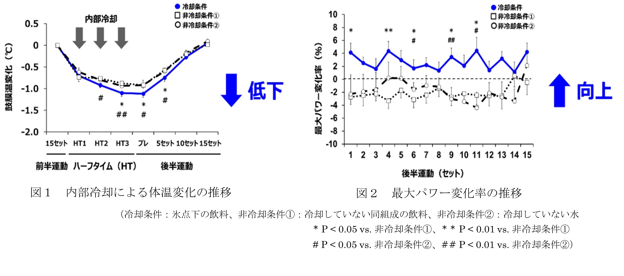 スポーツの現場では、暑熱環境対策として、身体内部から深部体温の上昇を抑制する手法の活用が拡大しています。本研究では、内部冷却が体温及び運動パフォーマンスに及ぼす効果を検証いたしました。その結果、非冷却条件下と比べて、内部冷却により、速やかに鼓膜温度が低下(図1)すること、さらに、自転車エルゴメーター運動により評価される運動パフォーマンス(最大パワー)が向上することが確認されました(図2)。