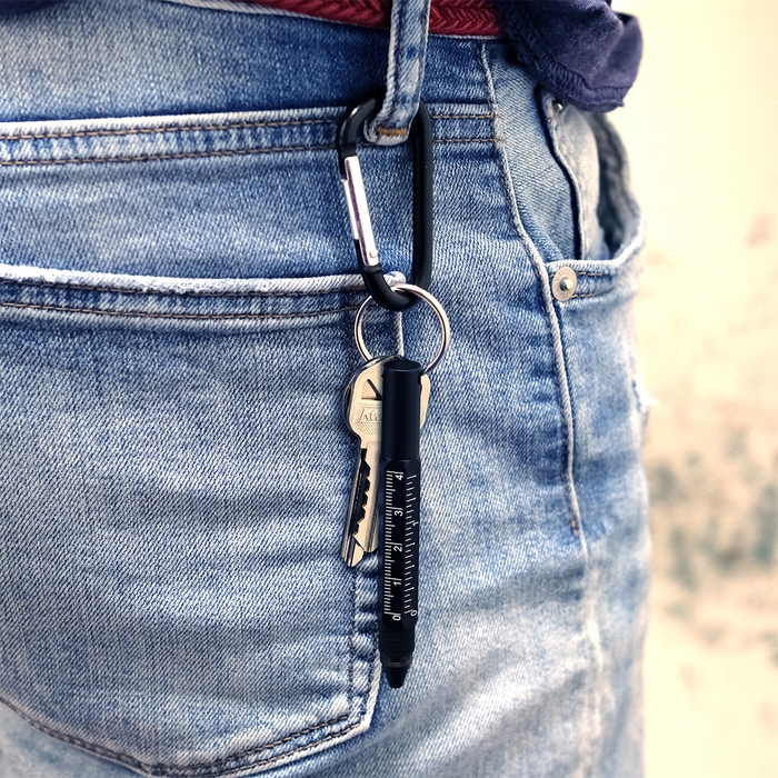 タッチペン、プラスドライバー、マイナスドライバー、定規、ボールペンを備えたコンパクトなマルチツールペン。ペンの上部にはキーホルダーがついているので、鍵やバッグなど手持ちのアイテムにかけて一緒に持ち歩くことができます。タッチペンはATM画面や店舗のタブレット端末などを非接触で操作したいときにも役立ちます。