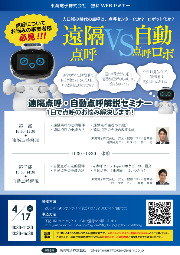アルコール検知システム、 IT点呼システム、 運行管理システムを開発・販売する東海電子株式会社(本社:静岡県富士市 代表取締役 杉本 哲也)は、 この度、「点呼についてお悩みの事業者様必見!遠隔点呼・自動点呼解説セミナー」ウェブセミナーを4月17日(水)に無料開催いたします。