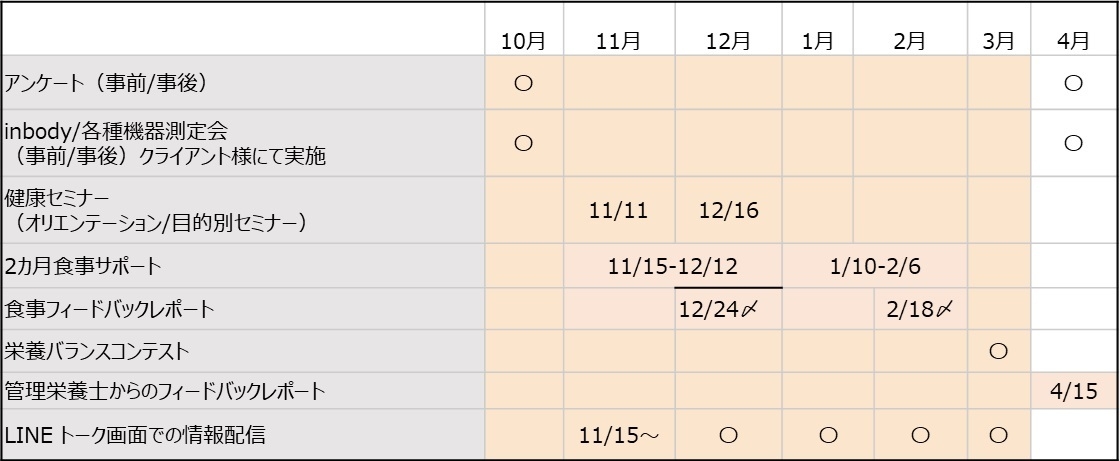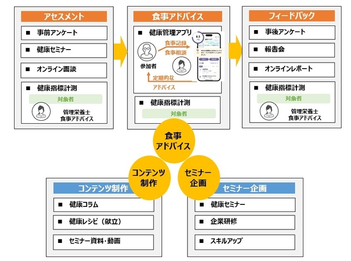 当社の健康支援プログラムは「食事アドバイス」「コンテンツ制作」「セミナー企画・実施」と大きく3つにわかれています。