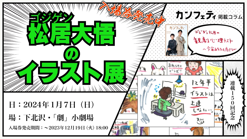 ロングランプランニング株式会社(東京都新宿区、代表取締役:榑松 大剛)が発行する2004年創刊のシアター情報誌「カンフェティ」では、初の主催イベント カンフェティ連載コラム「ゴジゲン松居の観劇心理テスト ~今宵あなたを癒さない~」より『ゴジゲン松居大悟のイラスト展』を、2024年1月7日(日)に下北沢「劇」小劇場(東京都世田谷区北沢2-6-6)にて開催予定です。11月15日(水)18:00よりチケット発売を開始しました。