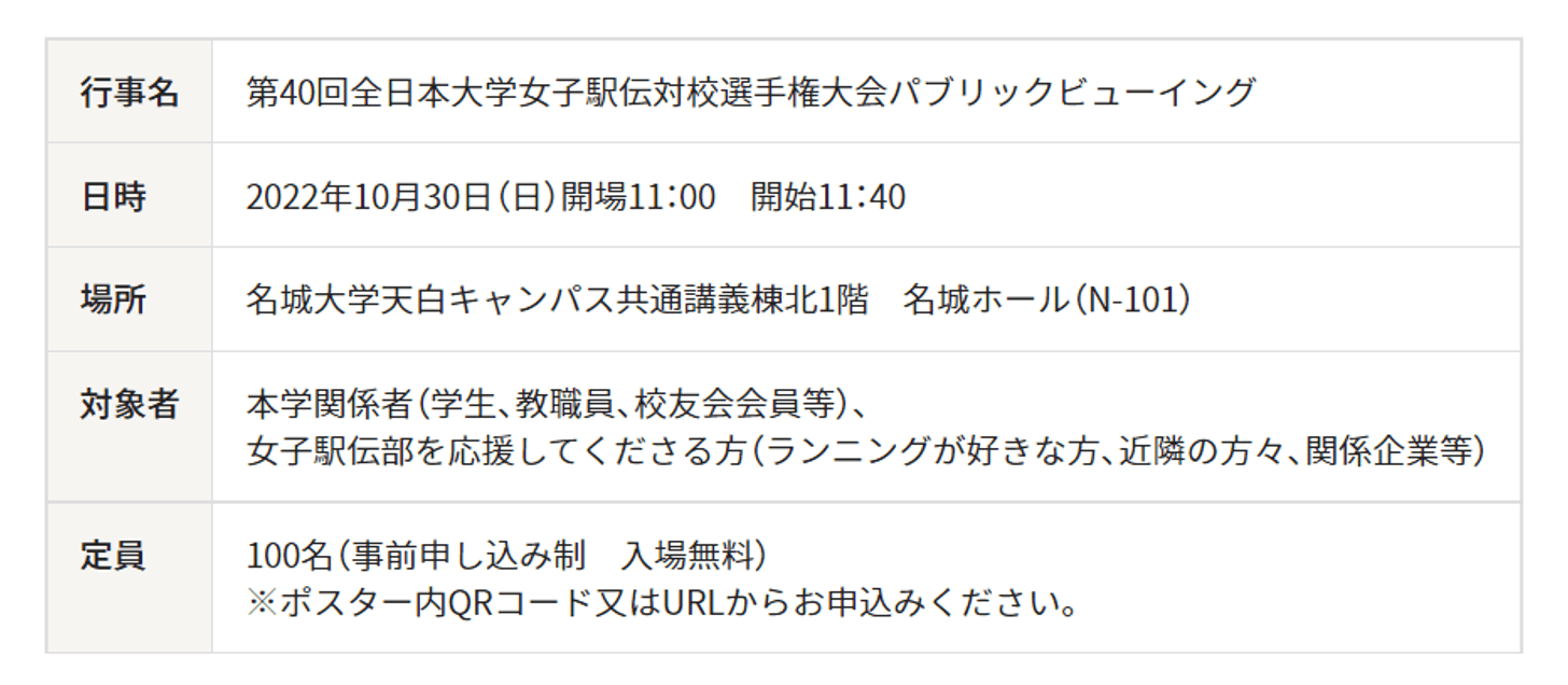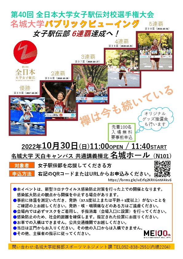 これまでは大学関係者のみで開催していましたが、今回より女子駅伝部及び名城大学を応援してくださるすべての方々と一緒に名古屋から応援したいと思っています。