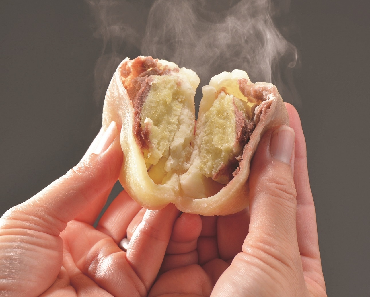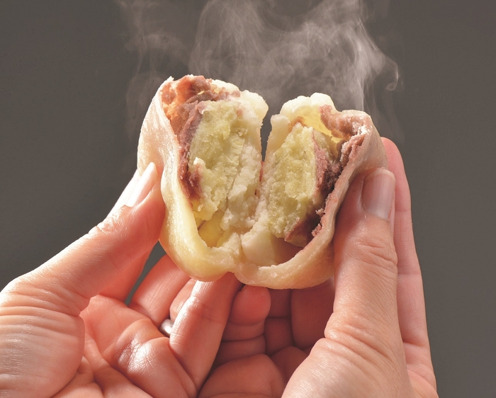 紫いきなり団子とは熊本県産のさつまいもの芯の部分だけ使用し、一口目の食べごたえを重視するプレーンタイプのいきなり団子の特徴はそのままに、生地と白あんに紫芋パウダーを練り込み色鮮やかに仕上げました。白あんを使用しているため、通常のいきなり団子にくらべあっさりとした味わいが特徴です。