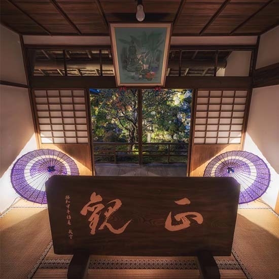 天皇家公家や特別なお客様のみをお通ししてきた上書院からは、戦前に重森三玲氏の古都百庭として選ばれた名勝庭園(浄土苑)が眺められ、その景色が大変美しいと多くのVIPに愛されてきた。映画「日本のいちばん長い日」のロケ地にもなり、近年、日本政府観光局の海外向け雑誌書籍はじめ多数メディアで紹介されています。
