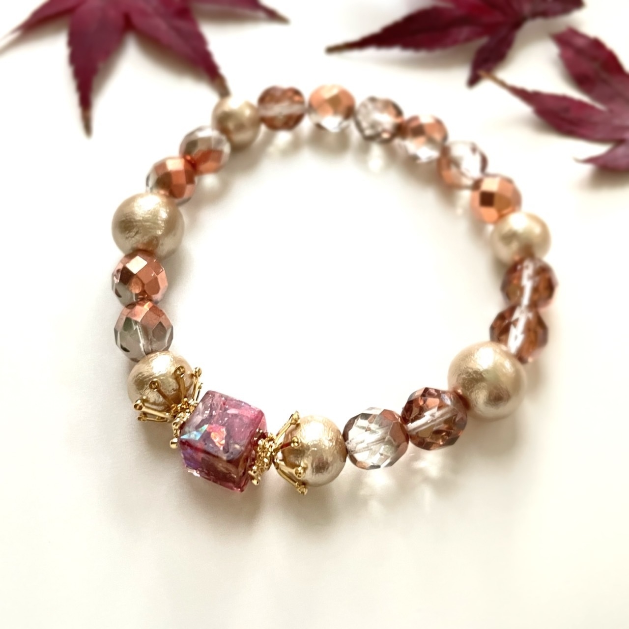 コットンパールや天然石、ガラスなどを使って、数珠ブレスレットが作れます。