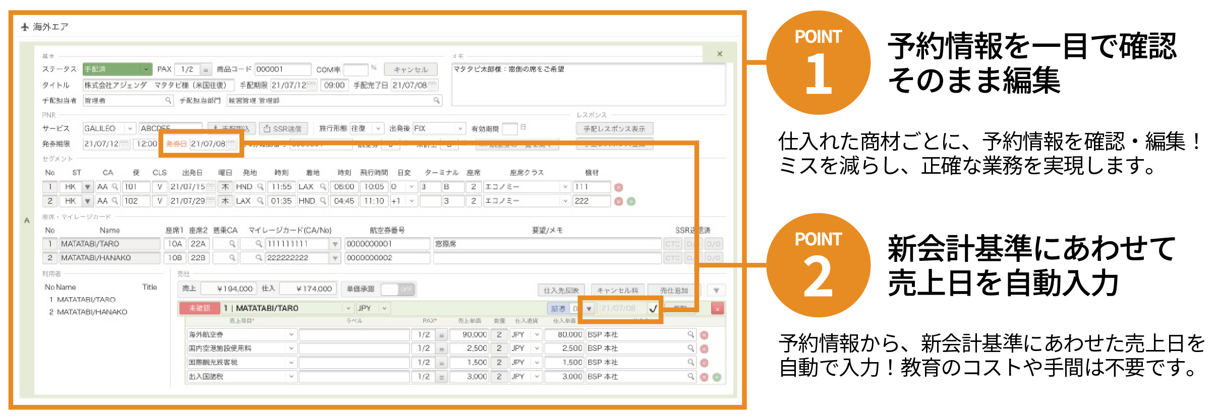 さらに本製品の操作画面には、「新会計基準に合わせた売上日の自動入力機能」を搭載。ホテルや航空券などの手配情報を入力すると、正しい売上日が自動入力されるため、新会計基準のルールを覚える必要はありません。新会計基準の学習や入力ミスへ対処する手間が不要になるため、コストダウンへ貢献します。