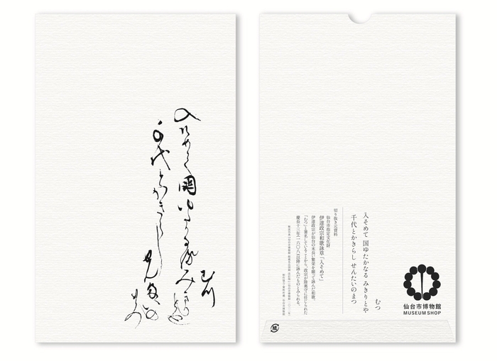 お買い上げいただいた商品を入れるショッパーは、伊達政宗が仙台の末永い繁栄を願って詠んだ和歌をプリントしました。「図録のページをそのままショッパーにしたい」という思いで、表には直筆書体をそのまま印刷し、裏には読み下し文と解説を記載しています。