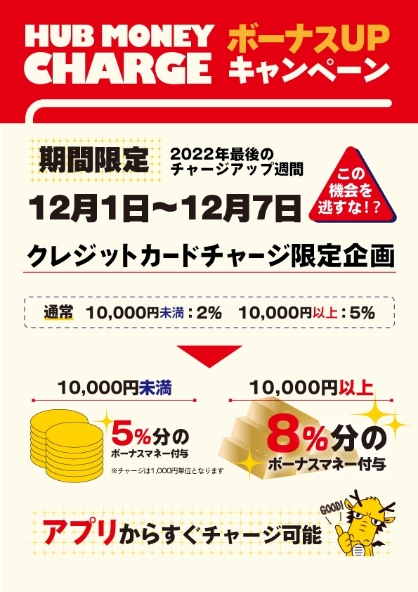 株式会社ハブ(本社:東京都千代田区、代表取締役社長:太田 剛)は、2022年12月1日から 2022年12月7日の期間で、「ハブマネーチャージボーナスUPキャンペーン」を実施いたします。