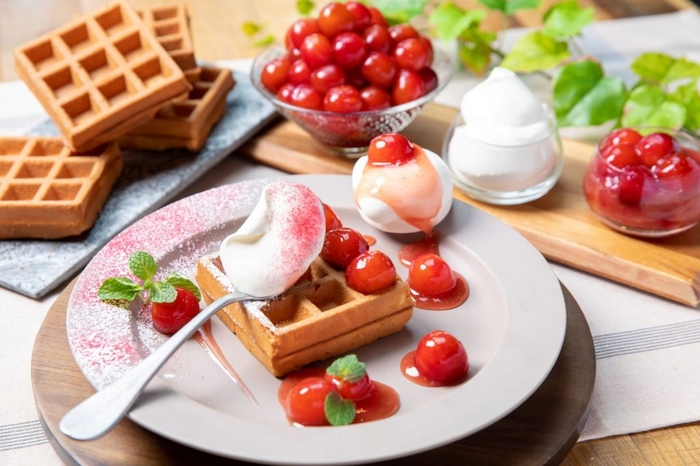 朝食ビュッフェで提供。「完熟さくらんぼワッフル」