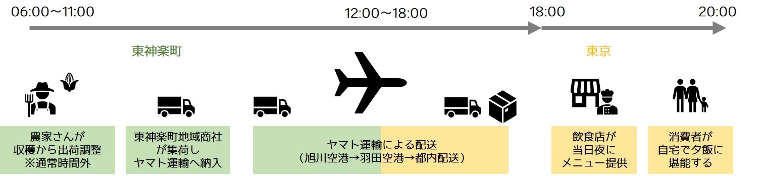 東神楽町は、町内に旭川空港があり、北海道内で5番目に面積が小さい町です。従来は、東京都内の消費者に農産物をお届けするまで2日以上かかっていました。東神楽町地域商社は、ヤマト運輸と東神楽町の包括連携協定の事業の一環として、旭川空港から飛行機を活用し、当時中に農産物を東京都内の飲食店にお届けします。第1弾は、5月27日に北海道の高鮮度な朝どれアスパラガスで実施します。