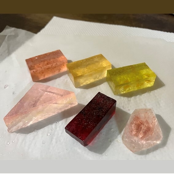 まるで宝石のよう!小山田農園が地元産の果実を使用した5色の琥珀糖を販売します。龍江産のりんご、ブルーベリー、イチゴ、桃と阿智村産の柚子を使用しています。