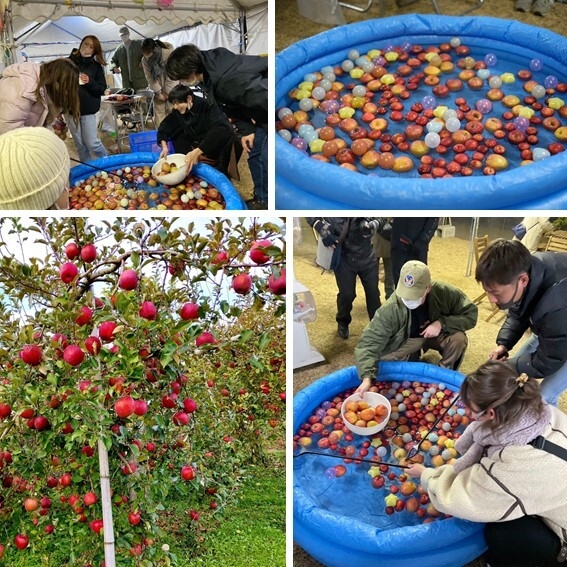 ビニールプールの中の規格外りんごを制限時間内に道具を利用してすくうゲームです。救ったりんごはお持ち帰りできて、大人だけではなく子供も一緒に楽しめます。