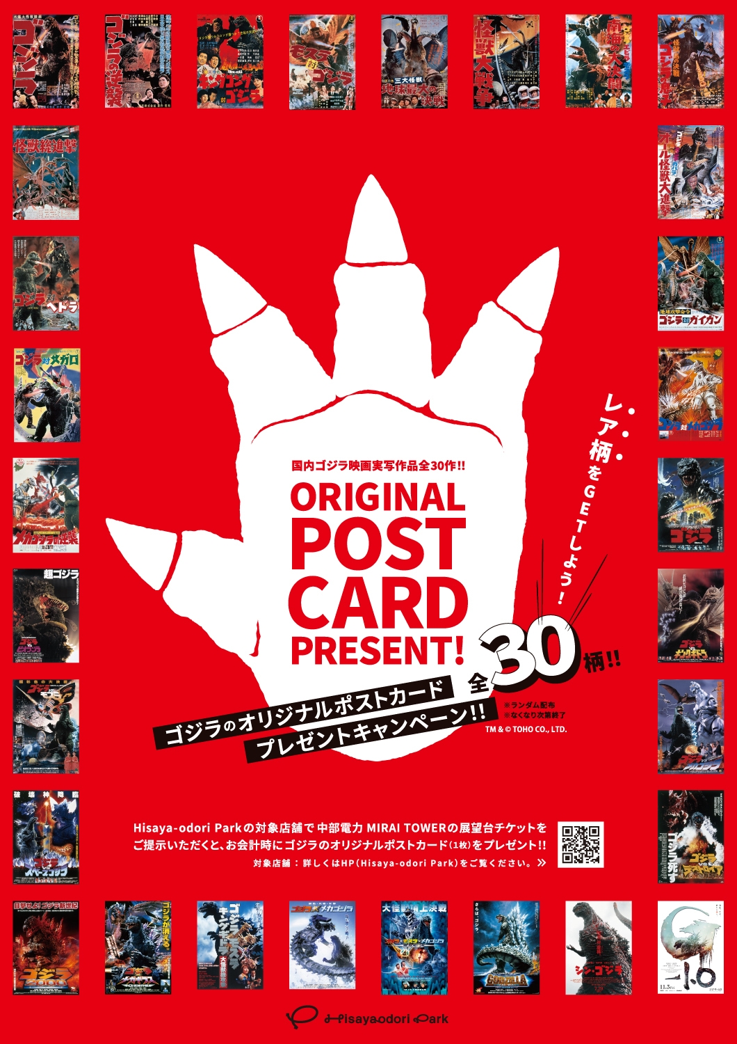 Hisaya-odori Parkの対象店舗で中部電力 MIRAI TOWER展望台チケットをご提示いただくと、お会計時に、国内ゴジラ映画実写作品のポスタービジュアルを使用したポストカードをプレゼントいたします(全30柄)。どの店舗でどの柄がもらえるかは、行ってからのお楽しみ。