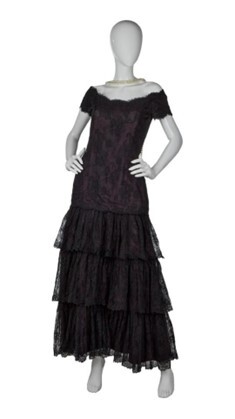 1987年にロンドンとドイツのハンブルグで彼女が着用した、ヴィクター・エーデルシュタインがデザインしたシルクとレースのイブニングドレスです。バンドレースの袖が特徴的なオフショルダードレスには、3段のギャザーレースが使用され、スペインのフラメンコ調のスカートに仕上がっています。エーデルシュタインはダイアナがウィリアム王子を妊娠していたときに初めて出会い、彼女がホワイトハウスでジョン・トラボルタとダンスをしたときに着た、有名なマーメイドテールスカートのインクブルーのベルベットのドレスを制作。これはダイアナ妃の最も影響力のあるルックの1つとなっています。