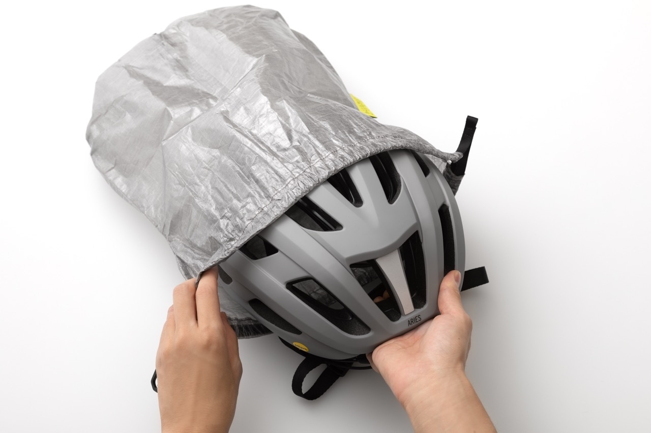 自転車のフレームやバックパックに吊り下げて手ぶらで持ち運べる、ストラップ付き自転車用ヘルメットバッグです。軽量でありながら、金属より強く薄いDyneema(R) Composite Fabricを使い、超軽量・コンパクトなサイズを実現しました。