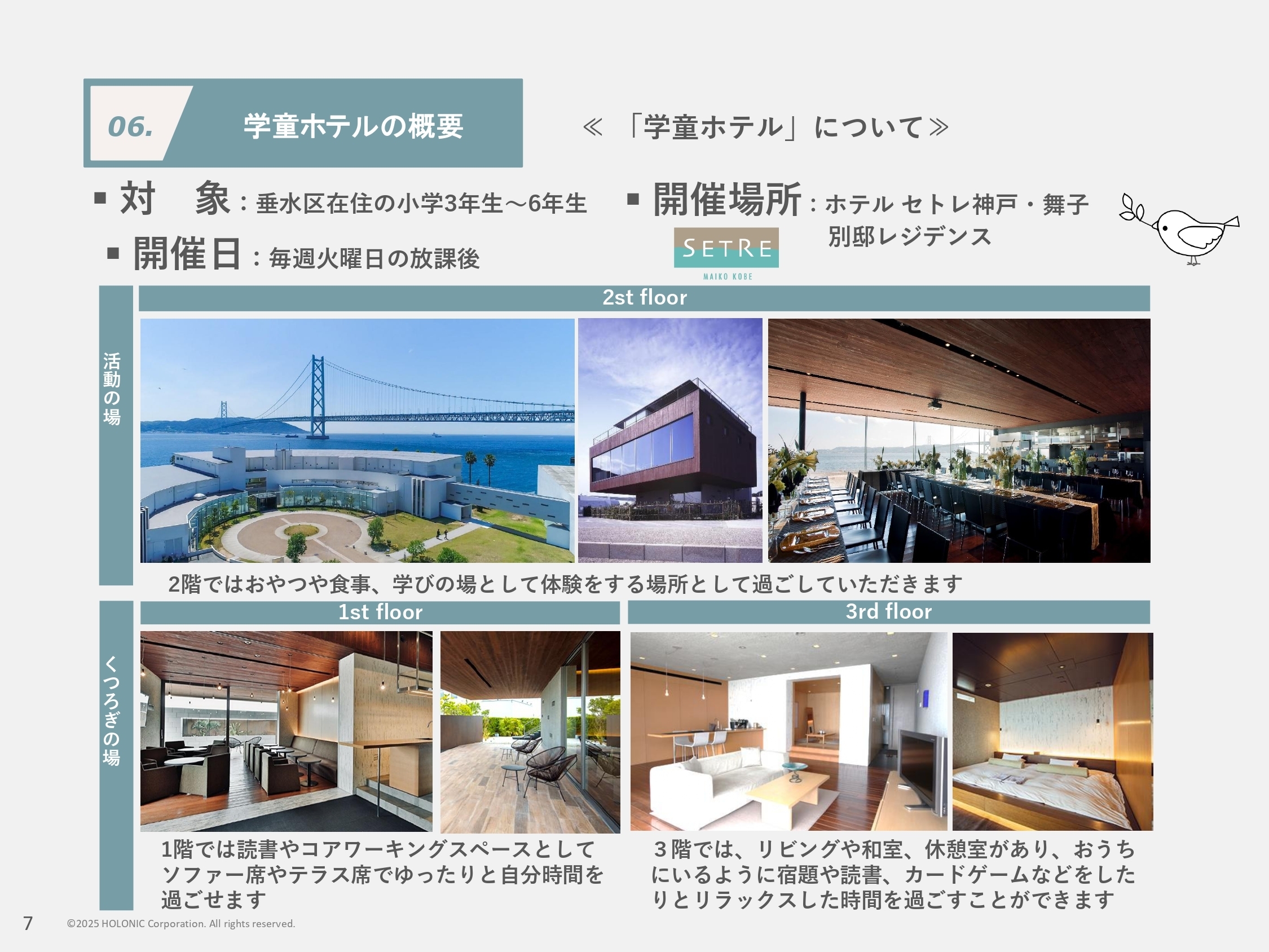 ホテル「セトレ」を運営する株式会社ホロニックは、これまでホテルを地域の魅力発信の拠点とし、地域に根差した体験型観光・交流を推進してまいりました。この経済活動をさらに発展させ、次世代の地域を担う子どもたちへの貢献を目的とした「学童ホテル」構想をスタートするため、非営利型一般社団法人ホロニックを設立いたしました。