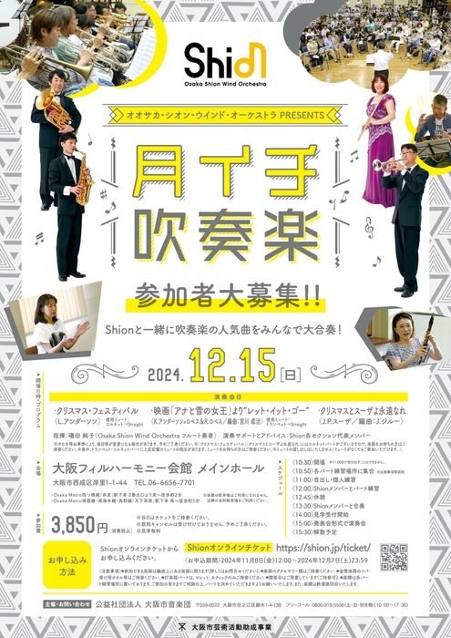 日本で最も長い歴史と伝統を誇る交響吹奏楽団のOsaka Shion Wind Orchestraを有する公益社団法人 大阪市音楽団(本社:大阪市住之江区/理事長:石井徹哉)は、月に一度、楽器を持っている方が集まって、Shionメンバーと一緒に吹奏楽曲を演奏できる人気イベント「月イチ吹奏楽」を2024年12月15日(日)に開催いたします。