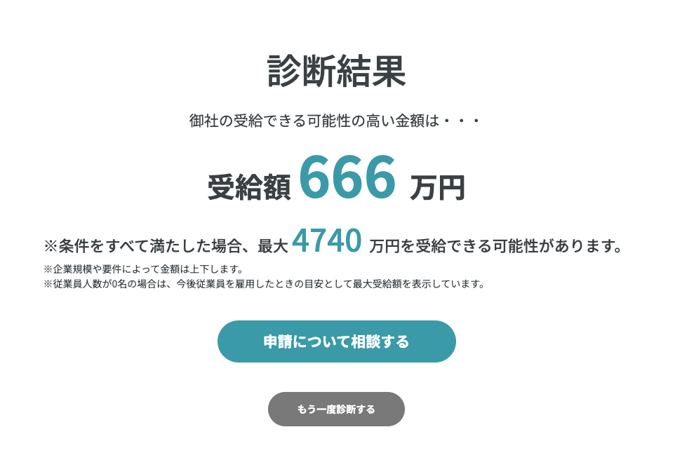 上記のように補助金・助成金で悩まれている企業様に向け、助成金診断サービス「使える助成金診断」は、設問に答えるだけで活用できそうな補助金・助成金をご提案できます。