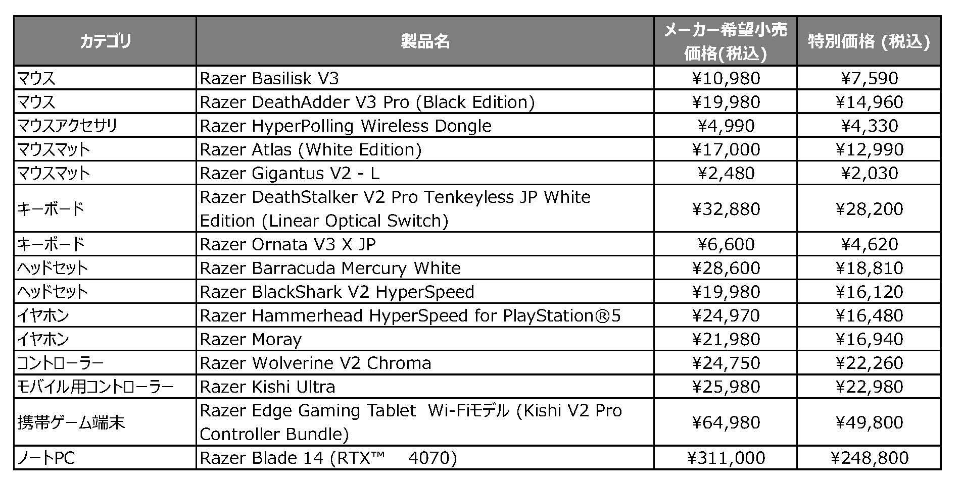 また、ワイヤレスながら高いマイク性能と軽量設計が特徴のヘッドセット「Razer BlackShark V2 HyperSpeed」や、手首への負担が少ないロープロファイルと高いデザイン性を兼ね備えたキーボード「Razer DeathStalker V2 Pro Tenkeyless JP White Edition Linear Optical Switch 」、「Razer Gigantus V2」など、幅広いニーズに応える製品もラインナップ。モバイルゲーマーには、144Hz AMOLEDディスプレイを備えた「Razer Edge」やiPad mini にも対応した究極のモバイルコントローラー「Razer Kishi Ultra 」もおすすめ。AMD Ryzen(TM) 9 7940HS プロセッサーとNVIDIA(R) GeForce RTX(TM) 4070 Laptop GPUを搭載し、携帯性とパフォーマンスを両立するゲーミングノートPC「Razer Blade 14」も過去最安値で登場します。