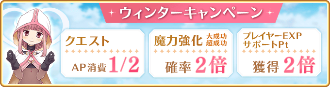 クエストAP1/2、プレイヤーEXP&サポートPt2倍、魔力強化大成功&超成功率2倍