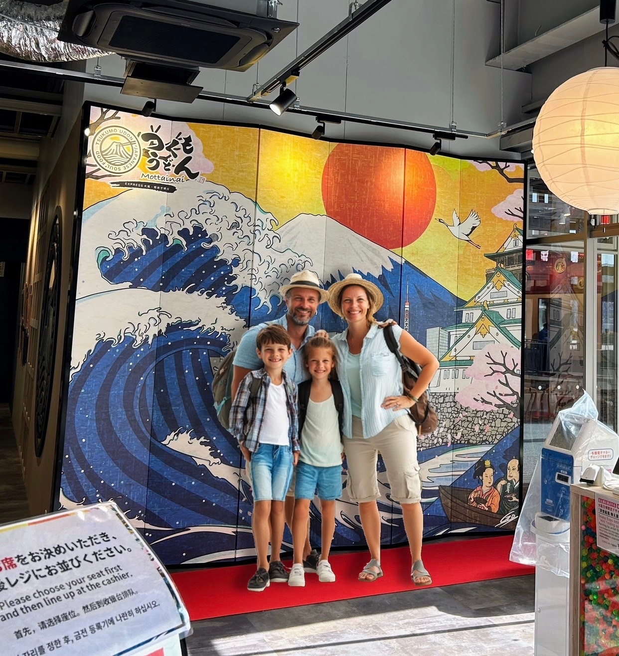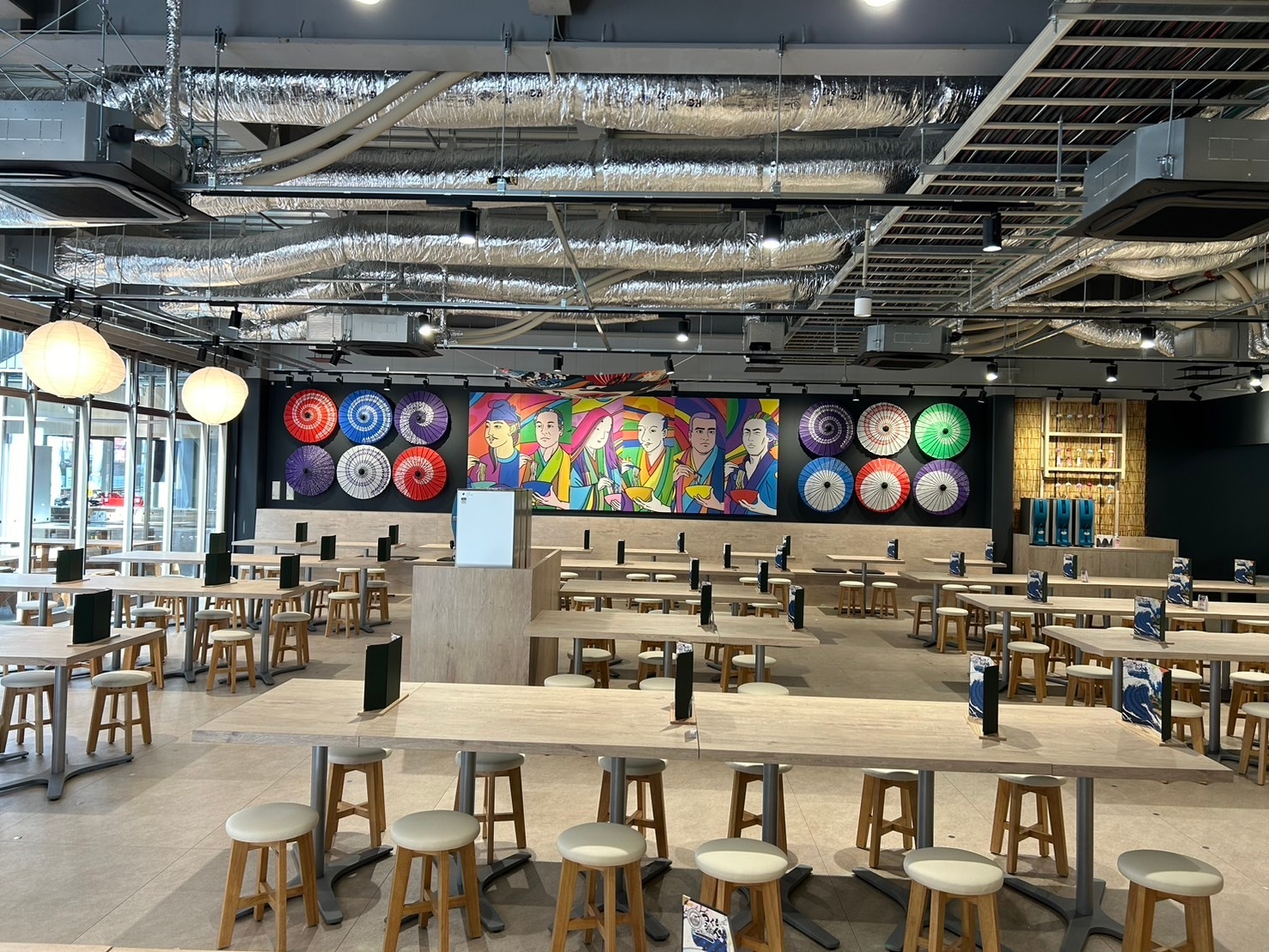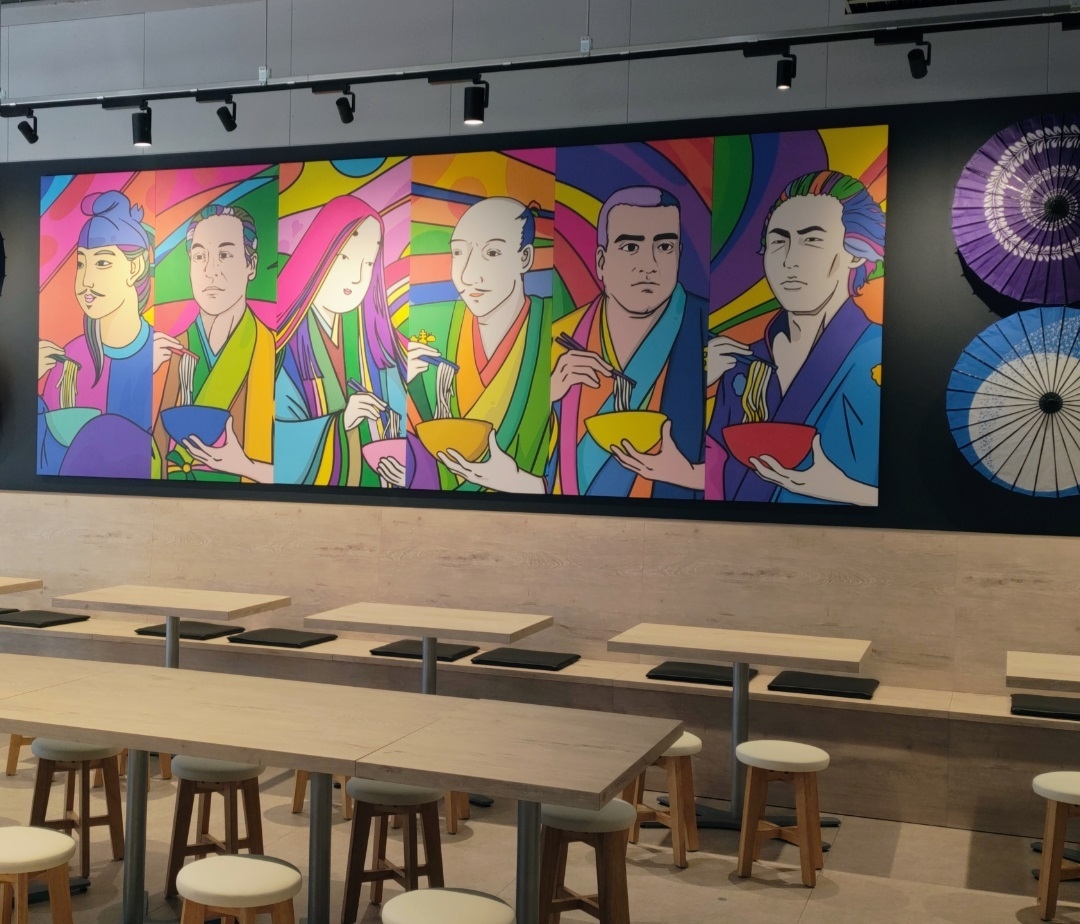 さらに、視覚障害とパニック障害と闘いながら描き続けるアーティストGO氏とコラボレーションし、日本のランドマークを浮世絵風ポップアートで描いた「大型屏風」を店内エントランスに設置。フォトスポットとして世界中のお客様に人気を博すことが期待されます。また、GO氏による作品『日本の歴史上の偉人たちがうどんを食べる姿のポップアート』も店内に展示し、食と芸術が融合した空間を演出します。