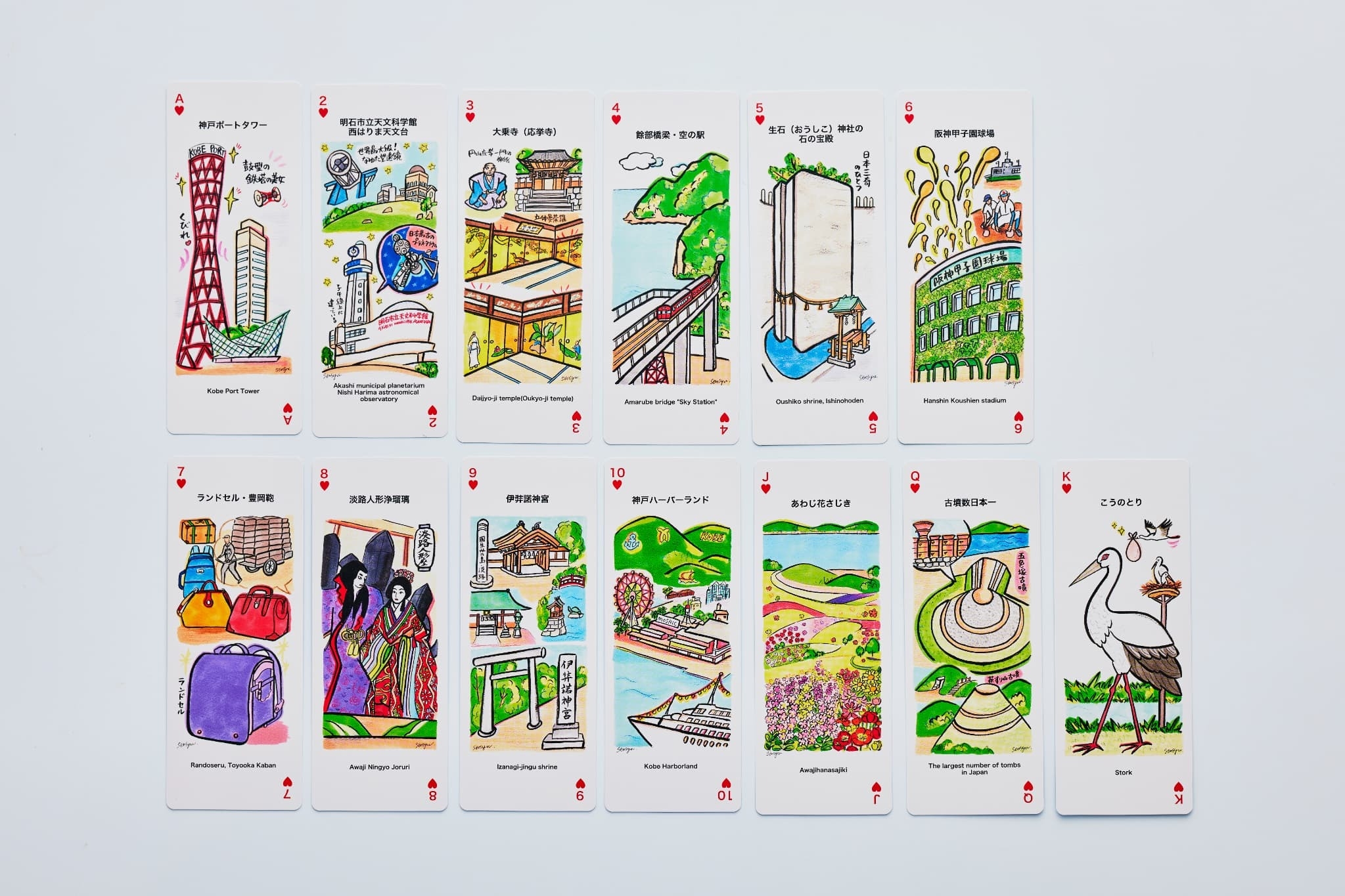 今回、自販機で販売する兵庫トランプは、当社が運営するウェブサイト「ゴトカン」で展開している自社商品のご当地トランプシリーズの1つです。54枚のトランプはすべて異なる図柄で、それぞれに兵庫県の名所や文化が描かれています。デザインは、関西のポップアートの第一人者である書道家・イラストレーターの千秋育子氏が手掛けており、同梱のトランプスタンドに飾ってアートとして楽しんだり、次の旅の目的地の参考にしたりと、楽しみ方はさまざまです。