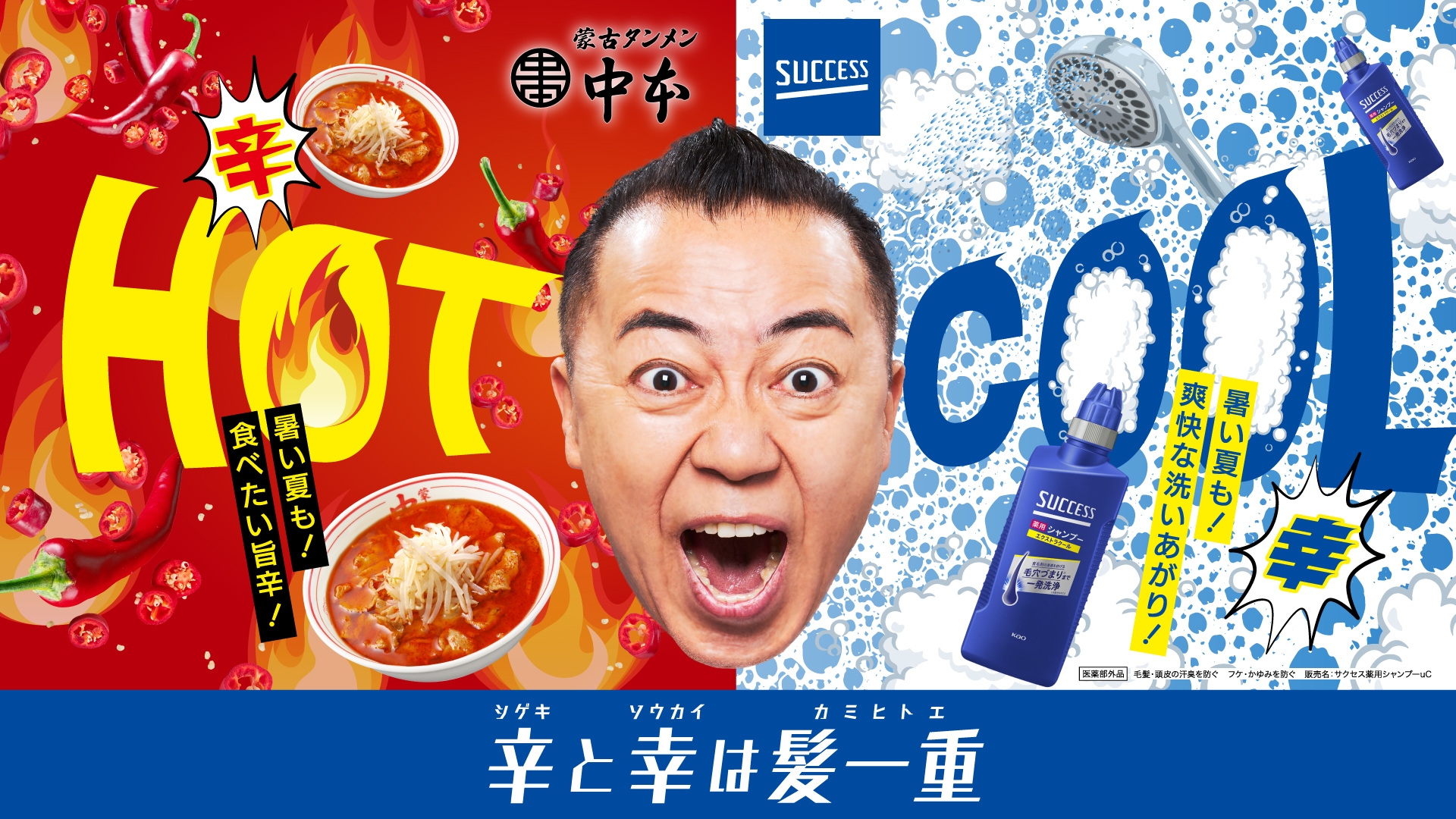 無性に辛い物が食べたくなるけれど、髪や頭皮が汗でベタついたままなのは避けたい夏。そんな夏を、思いっきり楽しんでほしい、という想いを込めて洗いあがりに爽快感を感じることができる『サクセス 薬用シャンプー エクストラクール』と、辛い物の代名詞・蒙古タンメン中本との初めてのコラボが実現!「辛(シゲキ)と幸(ソウカイ)は髪一重」のメッセージを伝えます。