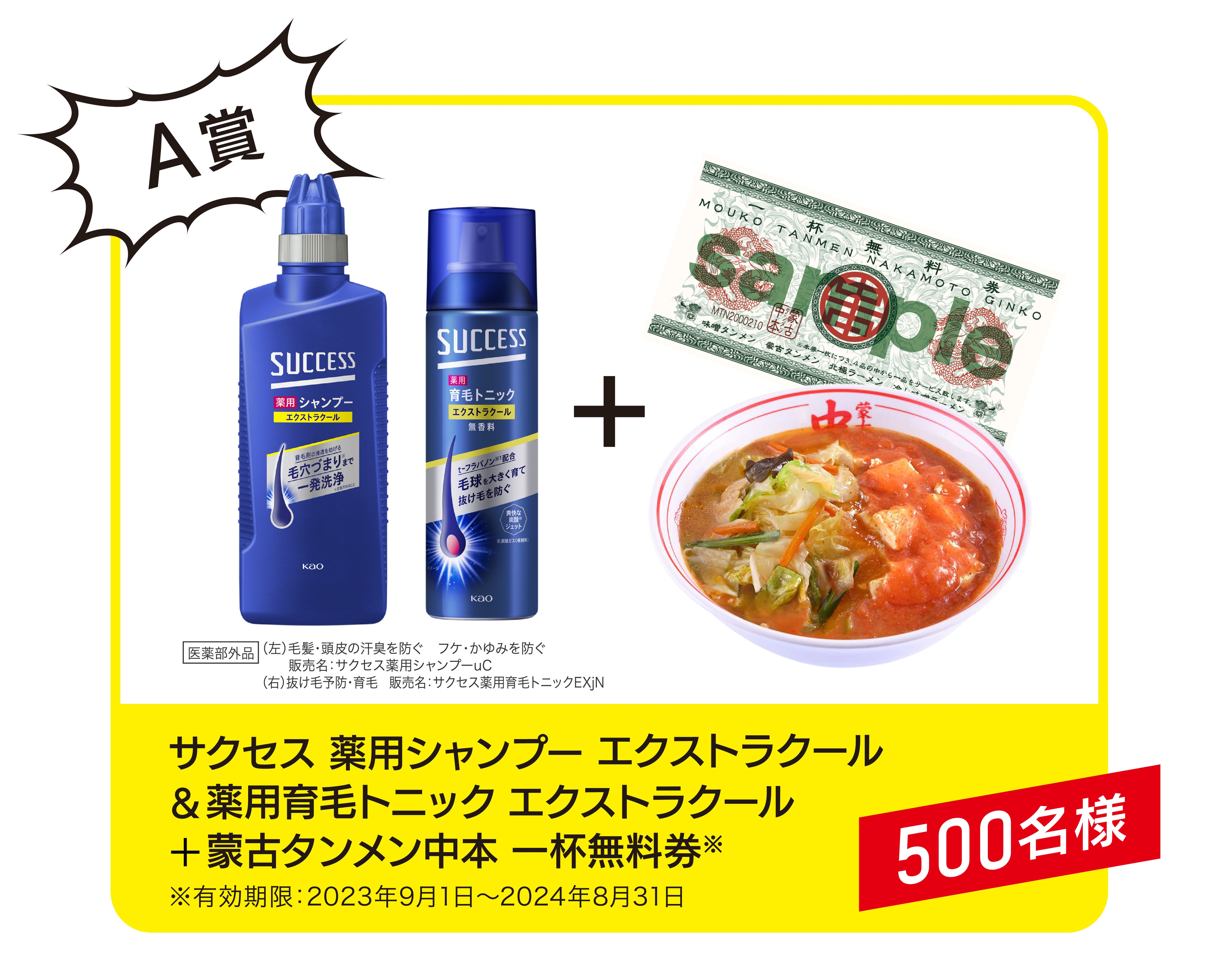 A賞:サクセス 薬用シャンプー&薬用育毛トニック(いずれもエクストラクール)+蒙古タンメン中本食事券のセット(抽選で500名様)