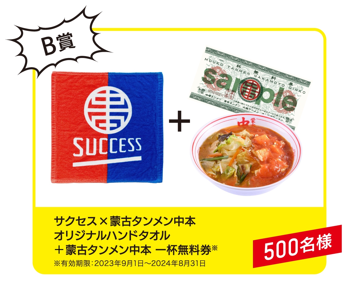 B賞:サクセス×蒙古タンメン中本オリジナルハンドタオル+蒙古タンメン中本食事券のセット(抽選で500名様)