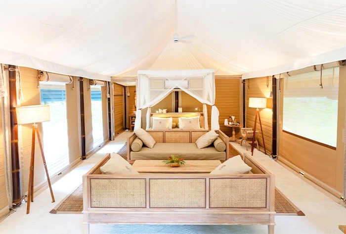 南国のリゾートを彷彿とさせるラタンの家具に、女子の憧れ「天蓋付き」キングサイズベッド、開放的なサニタリールーム。トイレ、シャワー、エアコン完備のお部屋は、テント内とは思えないラグジュアリーな空間です。