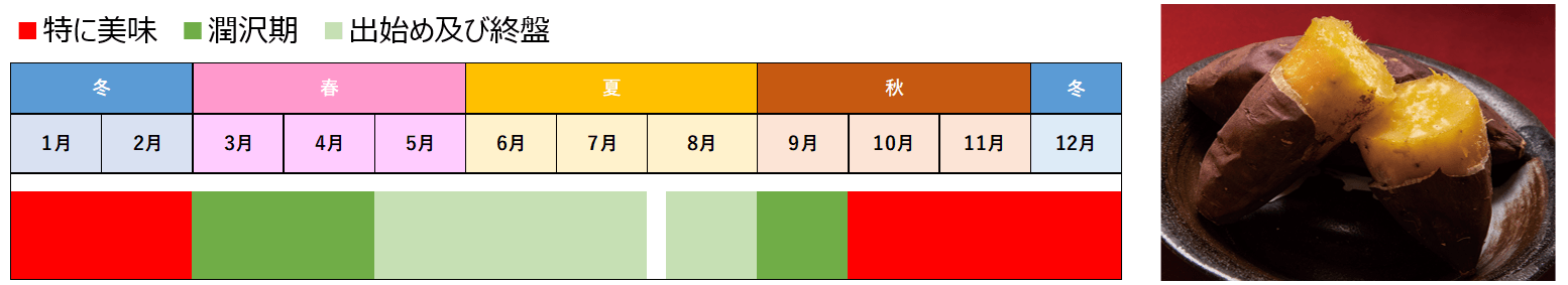 品種は、ねっとりした食感とスイーツのような濃厚な甘みが特徴の「べにはるか」や「シルクスイート」、香りが良く、ホクホクした食感と上品な甘みが特徴の「ベニアズマ」などがあります。例えばべにはるかでは、貯蔵期間を設けて順次出荷されています。