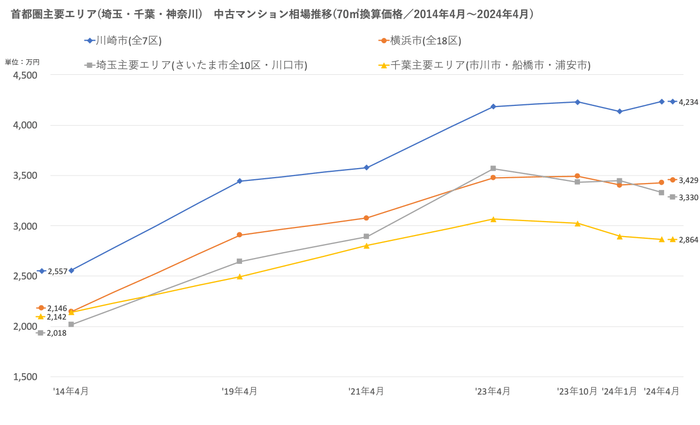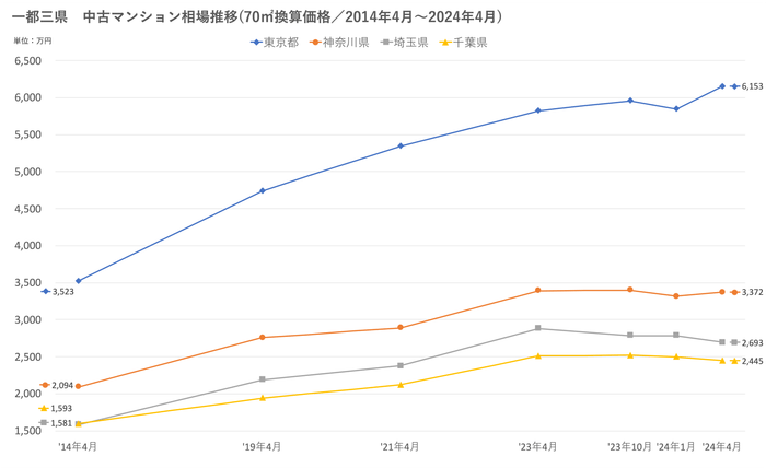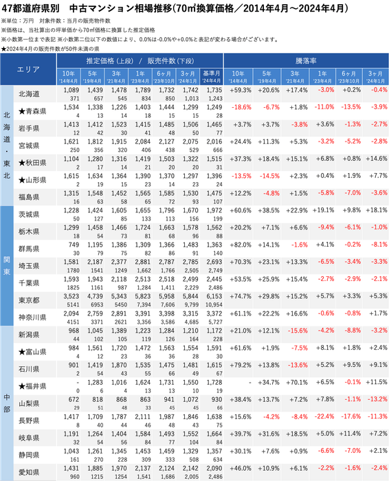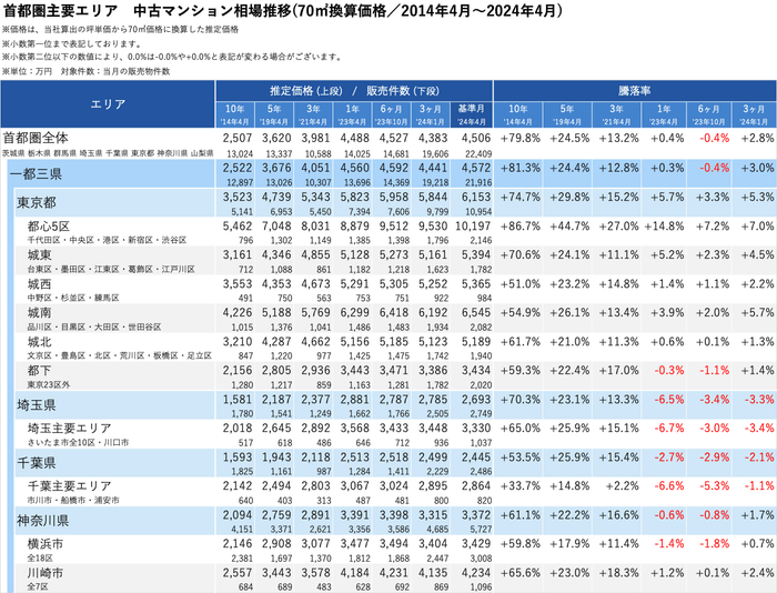 「不動産×WEB×ビッグデータ」の領域で、さまざまな不動産テックサービスを展開する株式会社ワンノブアカインド(本社:東京都港区、代表取締役社長:川島 直也、以下当社)は、当社が運営しているマンション情報サイト「マンションレビュー」の保有データを元に、全国の2024年4月の中古マンション相場を調査。坪単価をベースに70㎡での価格に換算した「中古マンション価格」*1について、10年前・5年前・3年前・前年からの推移を都道府県別・エリアごとにまとめましたので、発表いたします。