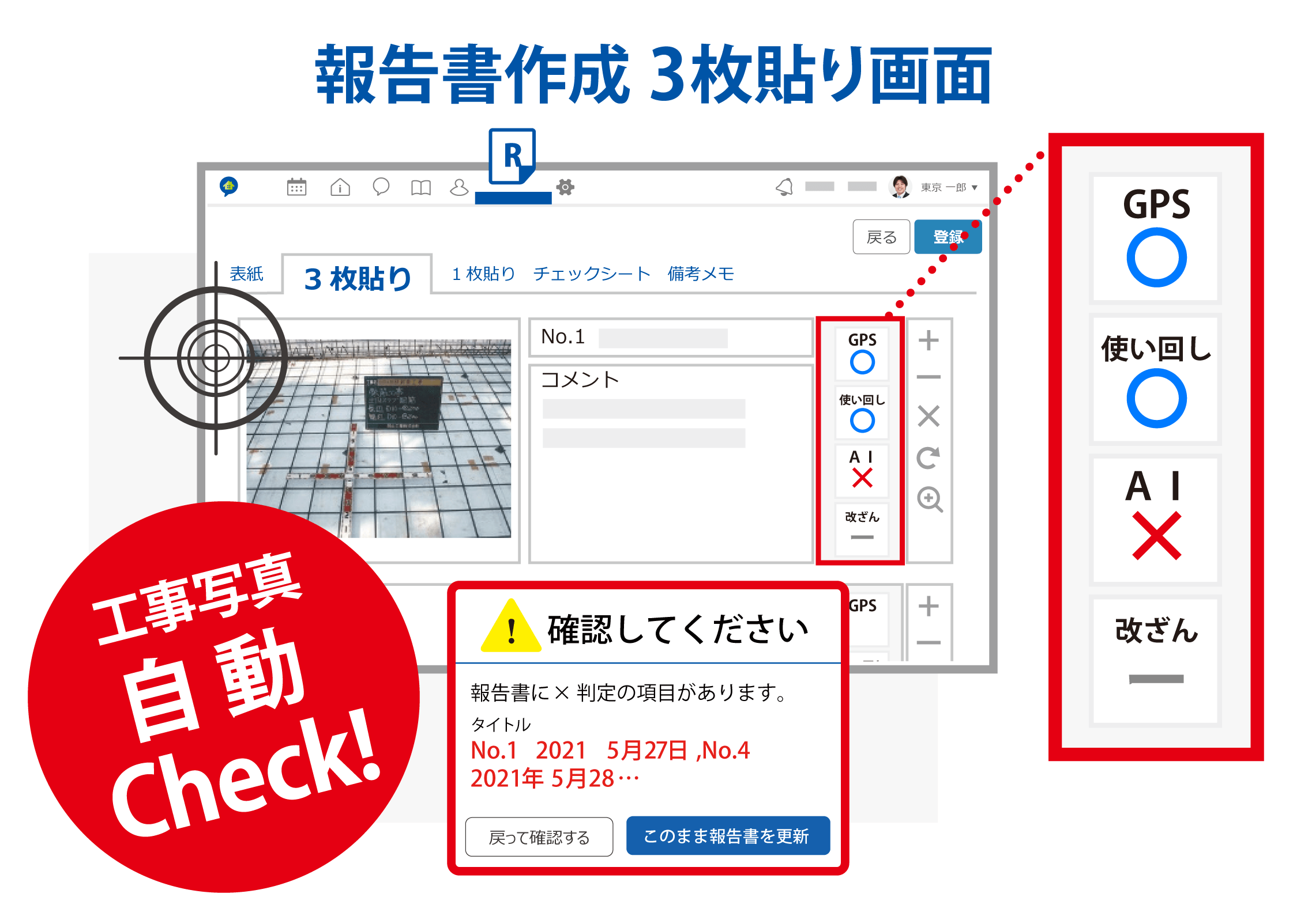 施工報告書に写真が貼り付けられたタイミングで4つの写真判定で自動検証。