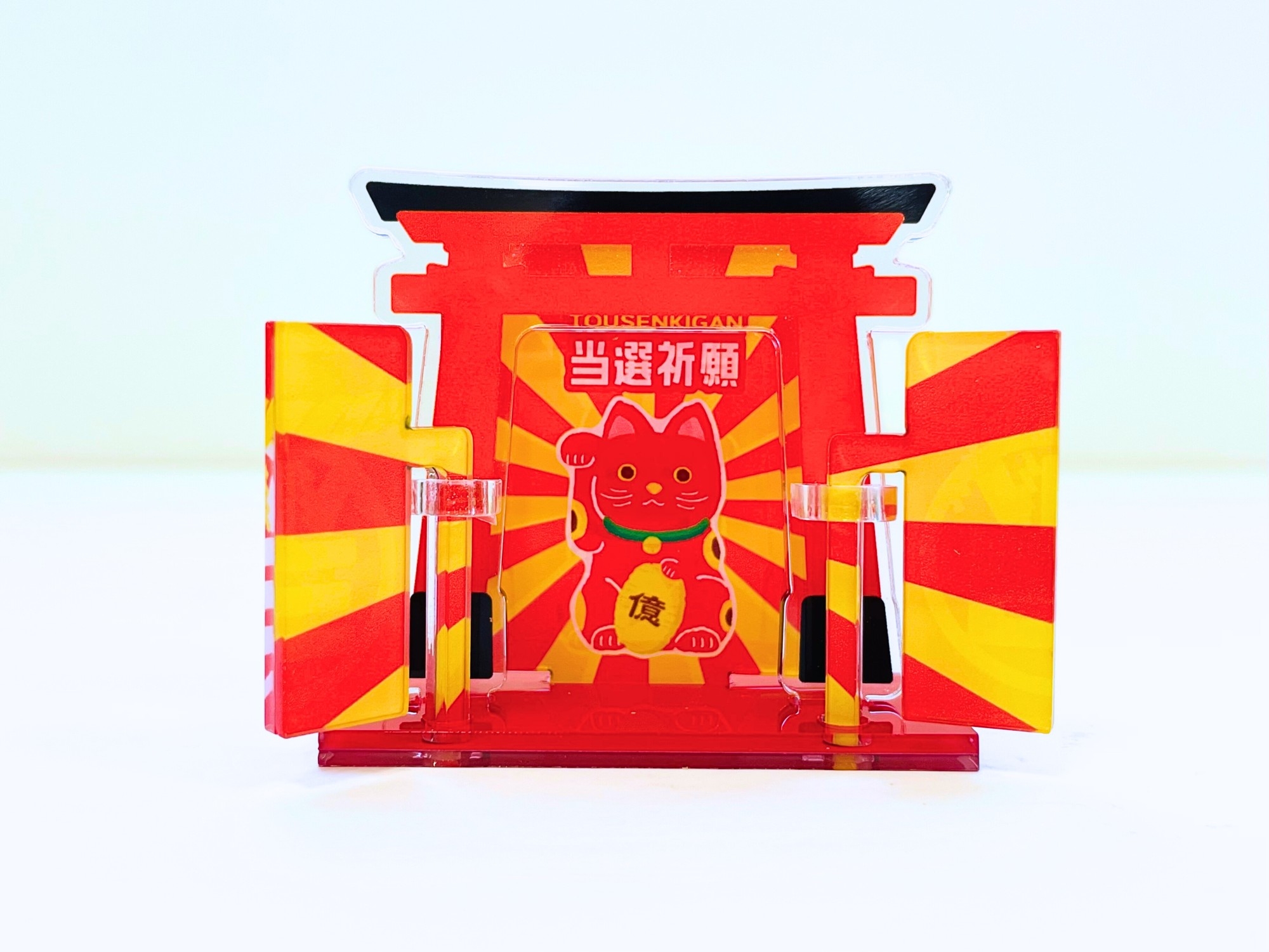 観音開きで扉が開き、扉の向こうには福を呼ぶ可愛い招き猫のイラストが描かれています。鳥居の背面には、宝くじ10枚を立てて置くことができ、卓上や運気の良さそうな場所に置いて毎日祈願すれば、高額当選するかも?!