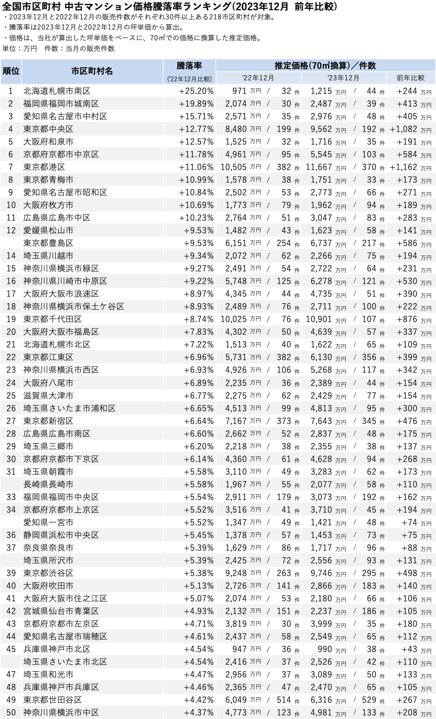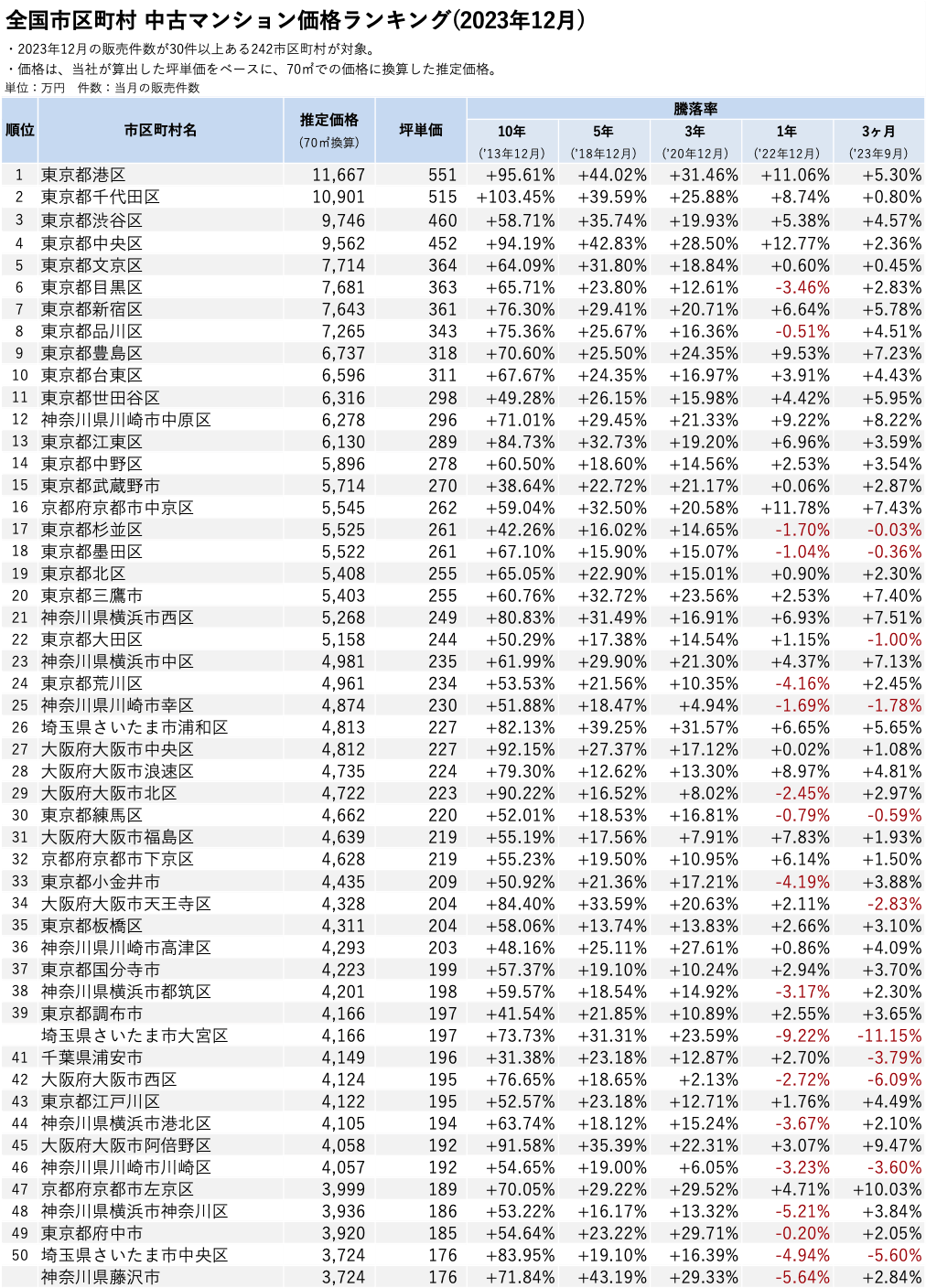 「マンションレビュー」2023年12月 全国市区町村 中古マンション価格/騰落率ランキング100を発表
