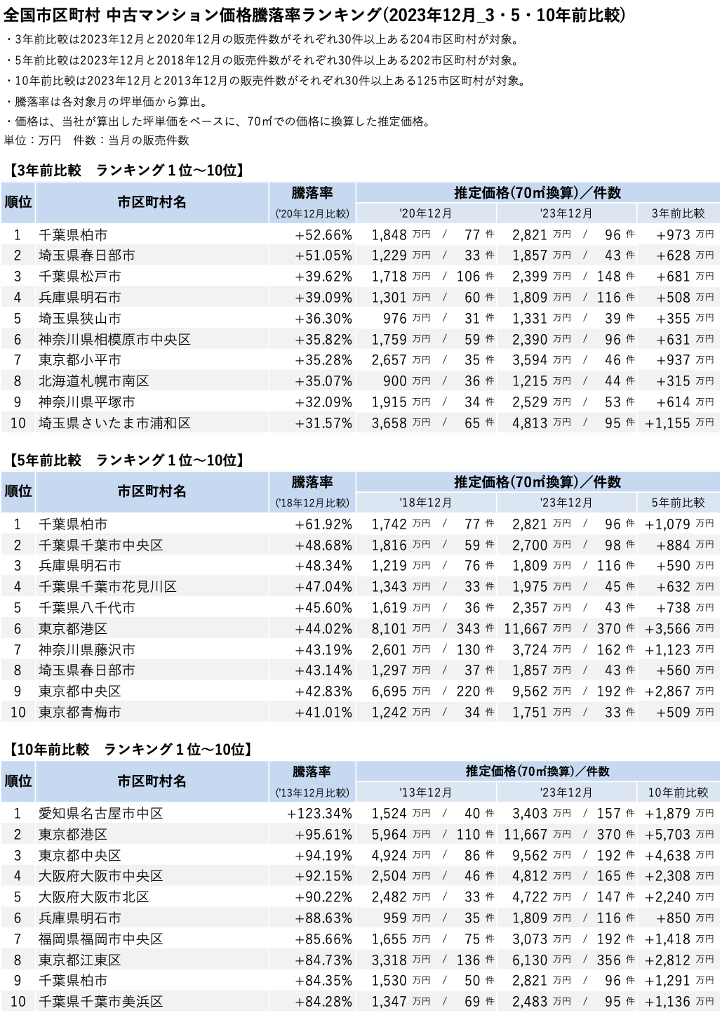■全国市区町村 中古マンション騰落率ランキング(2023年12月_3・5・10年前比較)