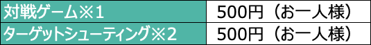 相手チームの各プレーヤーライフを0にして全滅、もしくは、制限時間内に生き残ったプレーヤー数で勝敗を決めます。参加人数は1~10名様、1セッション3ゲーム