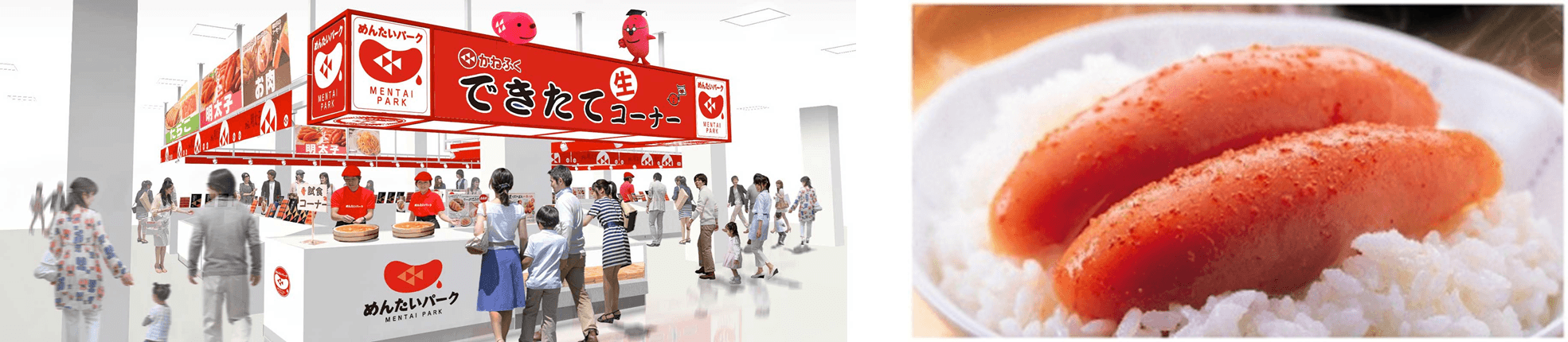 日本唯一の明太子専門テーマパークを運営する博多の老舗明太子メーカー「かねふく(創業 1971年)」は、素材へのこだわりと明太子づくりへの情熱を食を通してお届けしたいという想いから、見学ギャラリー、フードコーナー、直売店を併設した製造工場を2009年9月に茨城県大洗町に“めんたいパーク大洗”としてオープンし、現在は年間100万人を超える来場があります。その後「めんたいパークとこなめ」「めんたいパーク神戸三田」「めんたいパーク伊豆 」「めんたいパークびわ湖」を全国各地に展開し、来る4月21日に国内6施設目として関東内陸部初進出の群馬県に『めんたいパーク群馬』をオープンしました。