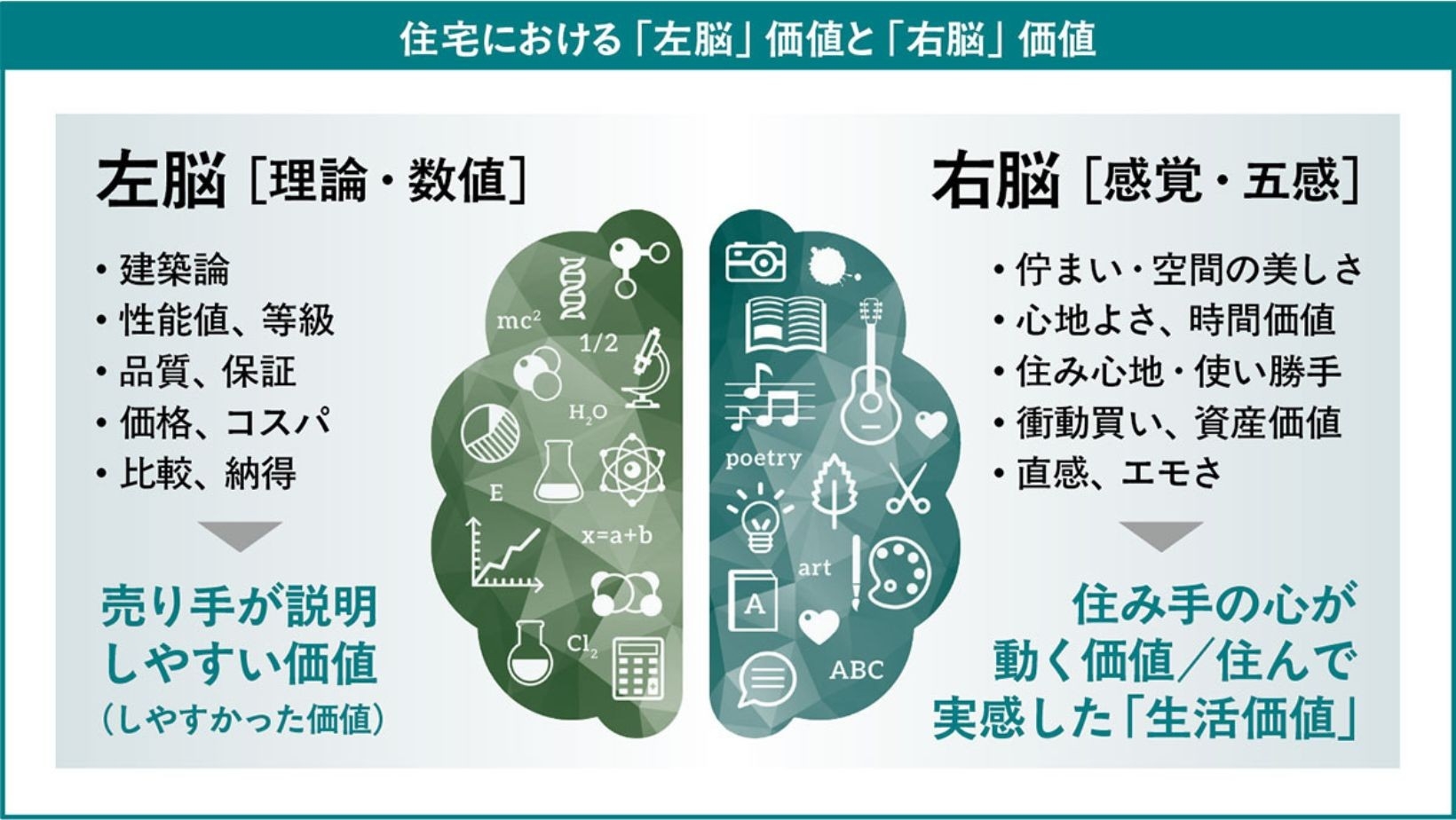 縮小する注文住宅市場のなかでもこの10年伸び続けてきたのが高性能住宅だ。だが性能のボトムアップが進み、高性能は標準に、さらには「足切り点」になった。上の図で言えば、性能を中心に「左脳」的価値が強く消費者に受け入れられた10年だったと言える。