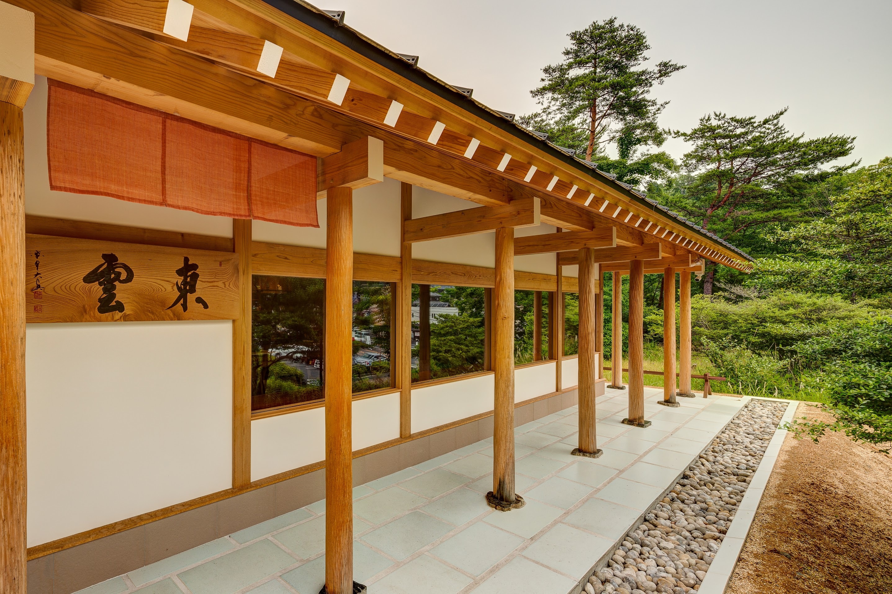 店名「東雲」は日本画家・森田りえ子先生の命名で、「東山に昇る朝焼けで、夜明けを告げる」という意味。エントランスに掲げられた扁額は、京都の大徳寺三玄院・長谷川和尚の筆で、店前で揺らぐ「京都草木染め 染司よしおか」ののれんは、まさに“朝焼け”を想起させるような美しい橙色。外床の白陶の版は大小屋の蛇窯で焼いたもので美しく輝きます。