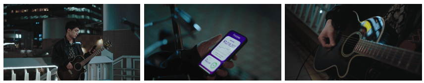 WEB CM「人生、自由に生きる。」には、そんな悩みとは真逆のキャラクターたちが登場します。ストリートミュージシャン篇に登場する主人公は、お世辞にも上手いとは言えない歌を熱唱。しかし本人は観客の反応など気にせず、本気で好きな歌を全力で歌い切り、楽しげで晴れやかな表情を見せます。不器用でも自分の夢に疑いなく向き合えるその裏側には、Fintokeiが提供するリスクなしで取引を学び、報酬を獲得するチャンスでお金への心配を払拭するパワーがあります。