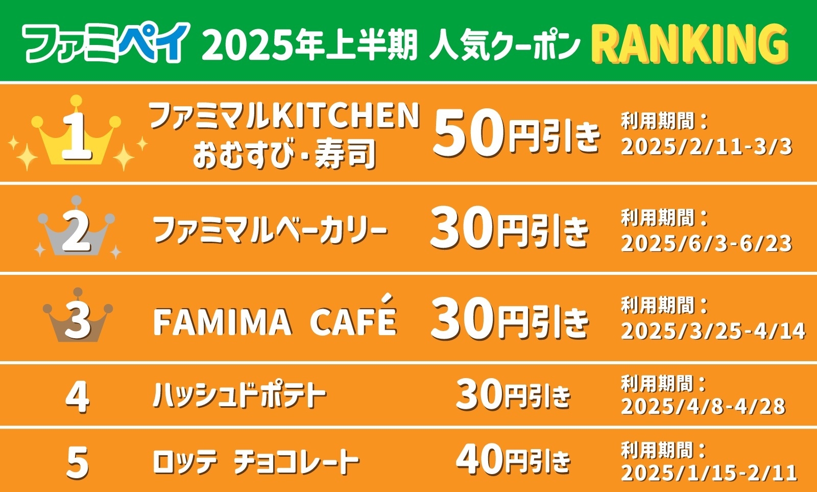 2025年1~6月に最も使われたクーポンは、「おむすび・寿司」の50円引きクーポン(利用期間:2月11日~3月3日)で、2位の「ファミマルベーカリー」の30円引きクーポン(利用期間:6月3日~6月23日)に対して約2倍の利用枚数となり、圧倒的1位でした。