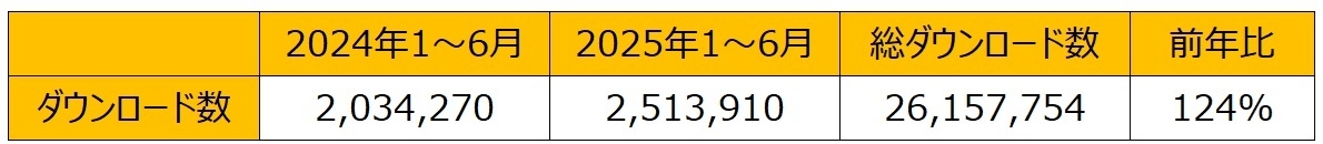 ・上半期ダウンロード数は約250万、累計ダウンロード数は約2,600万、前年同期比124%と伸長しました。