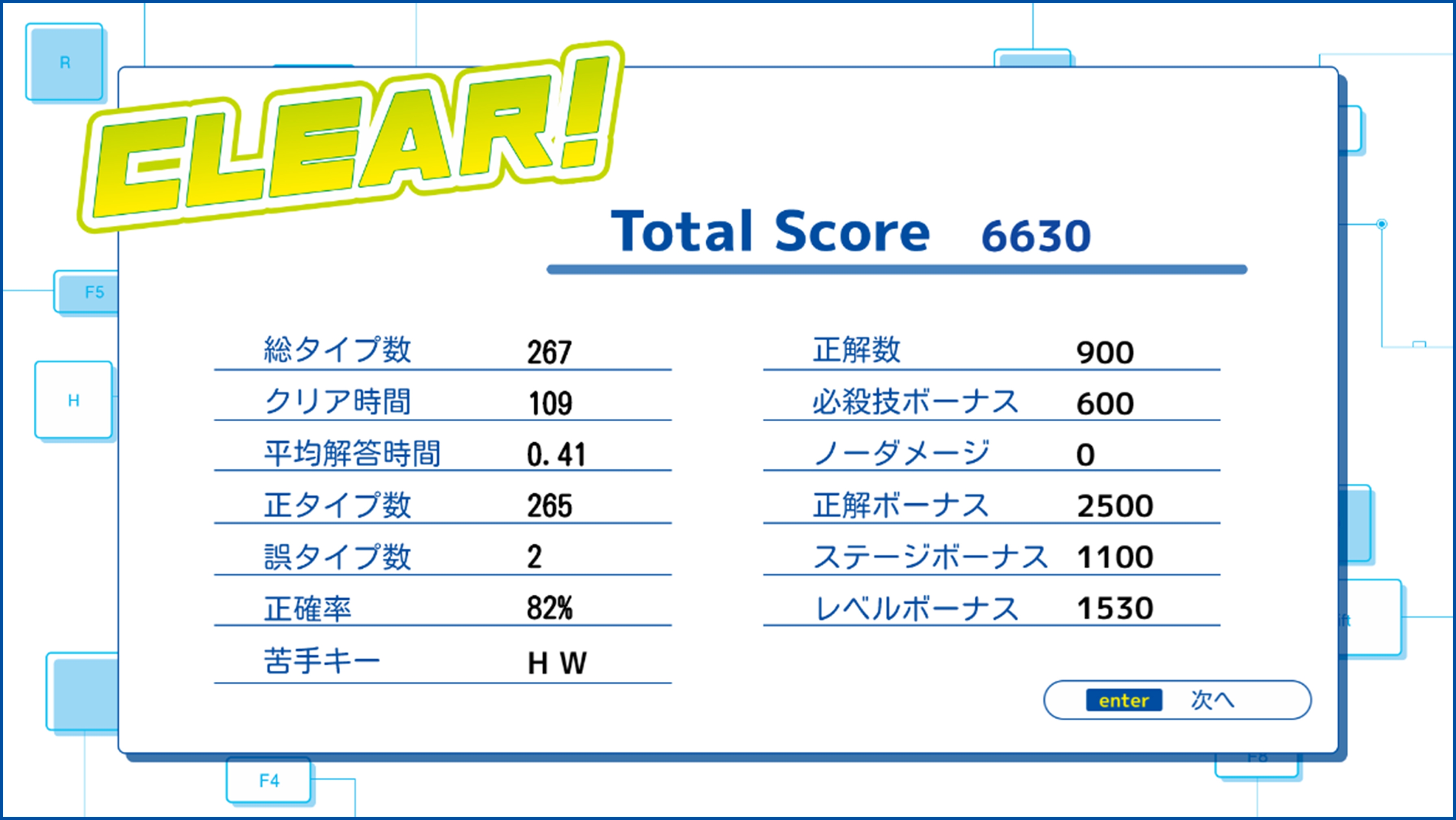 演出はあくまでも教育目的のタイピングソフトである事を前提にして出題される「題字」を入力し、