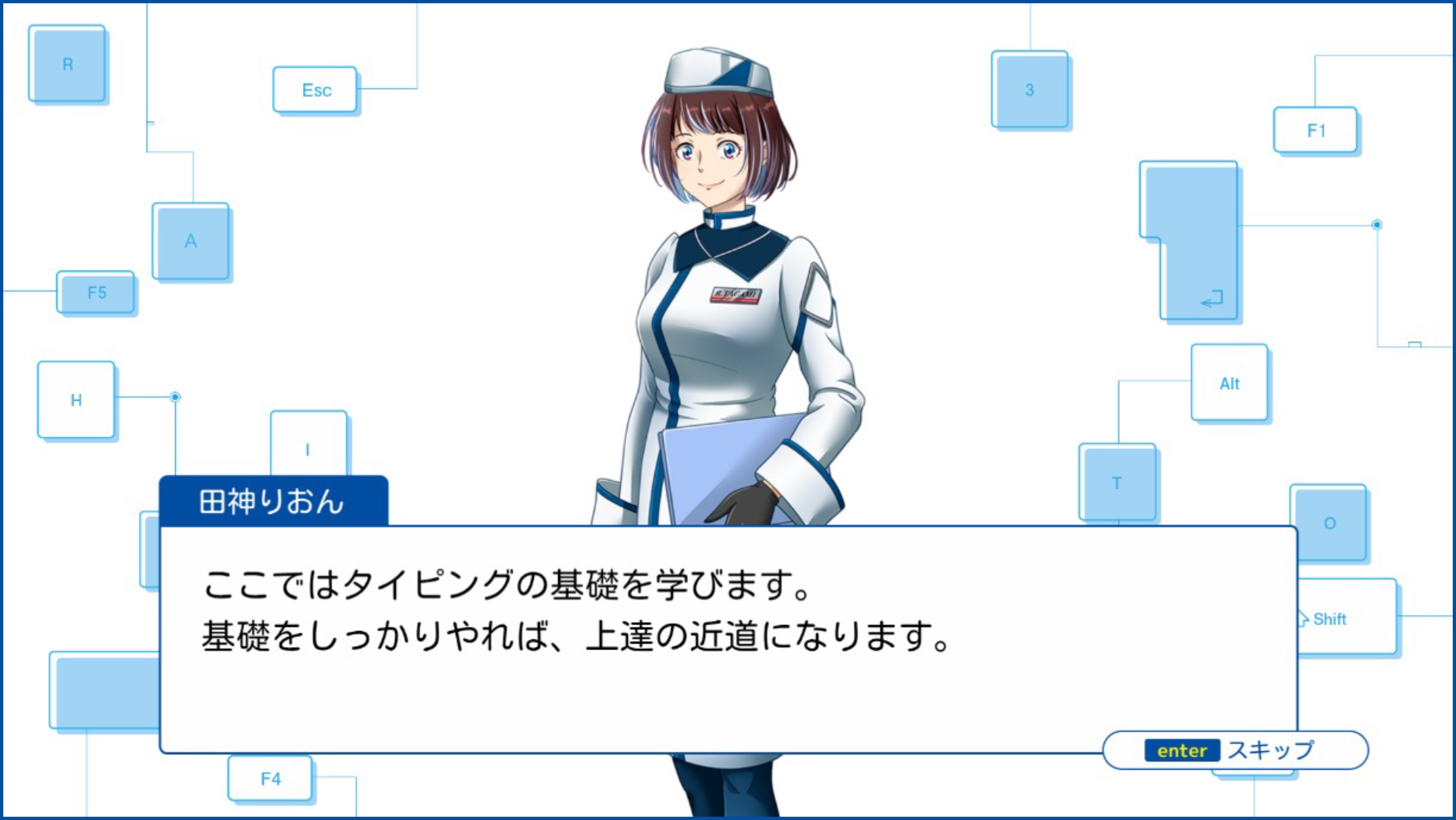 (3) 練習ステージ:ホームポジションやローマ字入力などタイピングの基本的な動作をオリジナルキャラクター、ナビゲーターの田神りおん(CV.M・A・O)が丁寧に教えてくれます。声を聞きながら学ぶことおができます。入力方法について重要性を説明すると共にローマ字の基本的な「母音」「子音」の使い方などをやさしく教えてくれます。