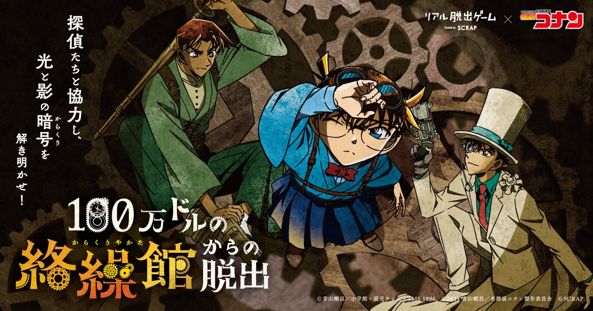 株式会社SCRAP(本社:東京都渋谷区 代表:加藤隆生)は、大人気テレビアニメ「名探偵コナン」とコラボレーションしたリアル脱出ゲームの最新作『100万ドルの絡繰館(からくりやかた)からの脱出』を全国9都市にて追加開催することを発表いたします。