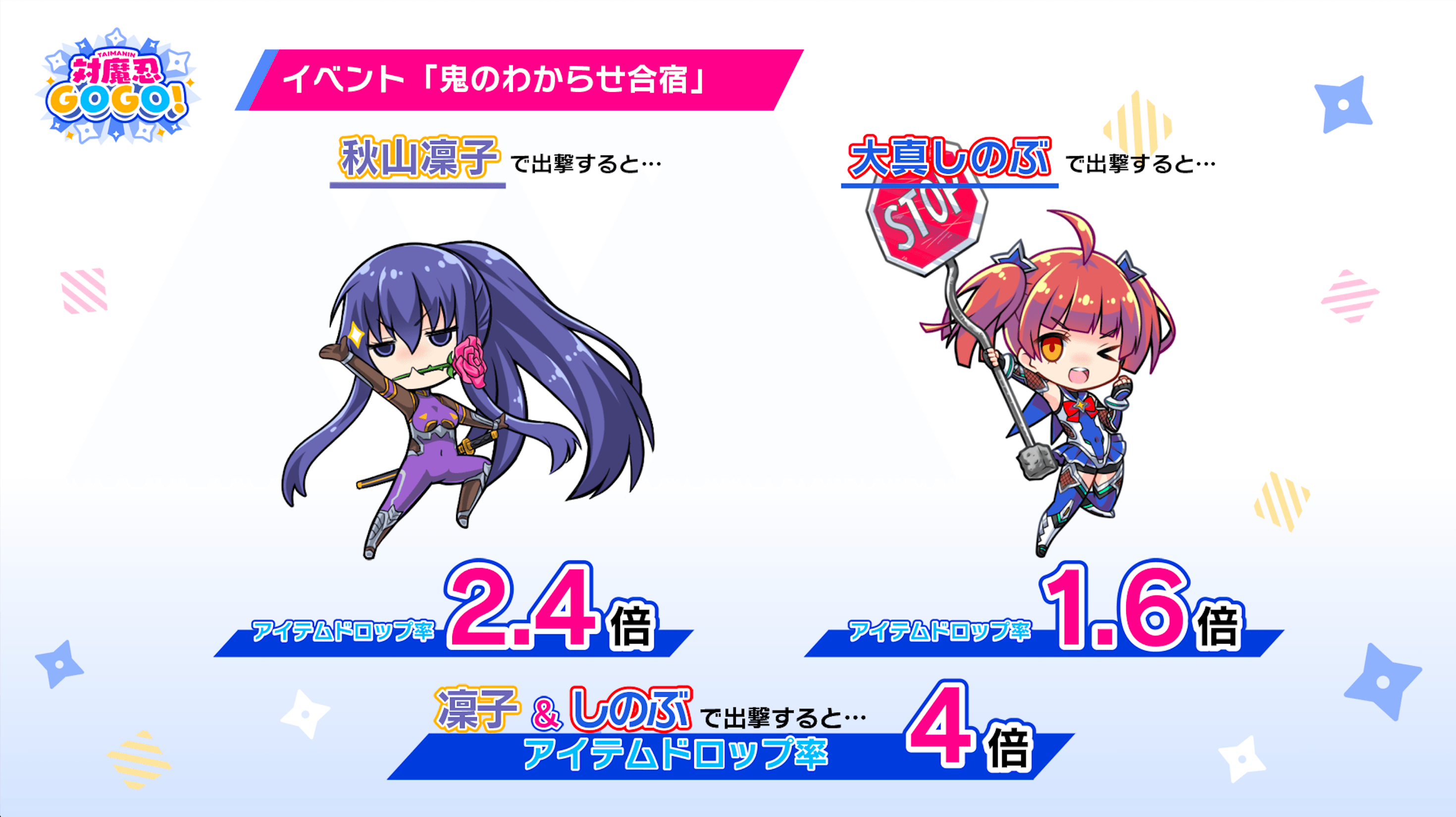開催期間中に「鬼のわからせ合宿」のクエストをクリアすることで獲得できる「対魔タオル」を集めたり、指定の条件を達成して期間限定の報酬を手に入れよう!