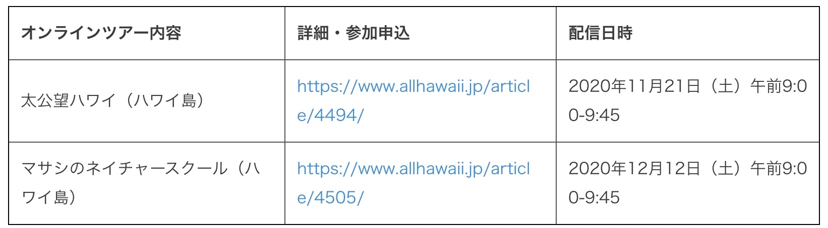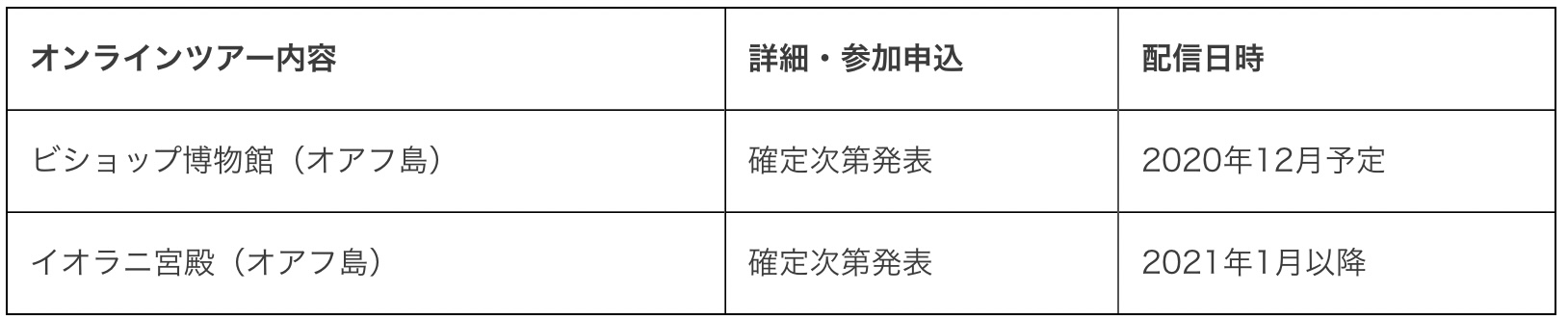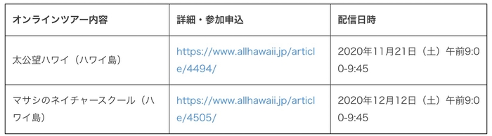 *上記プログラム内容は、2020年11月13日時点の内容です。今後、配信日時や追加ツアーが決まり次第公式ポータルサイトallhawaii内にて随時更新します。